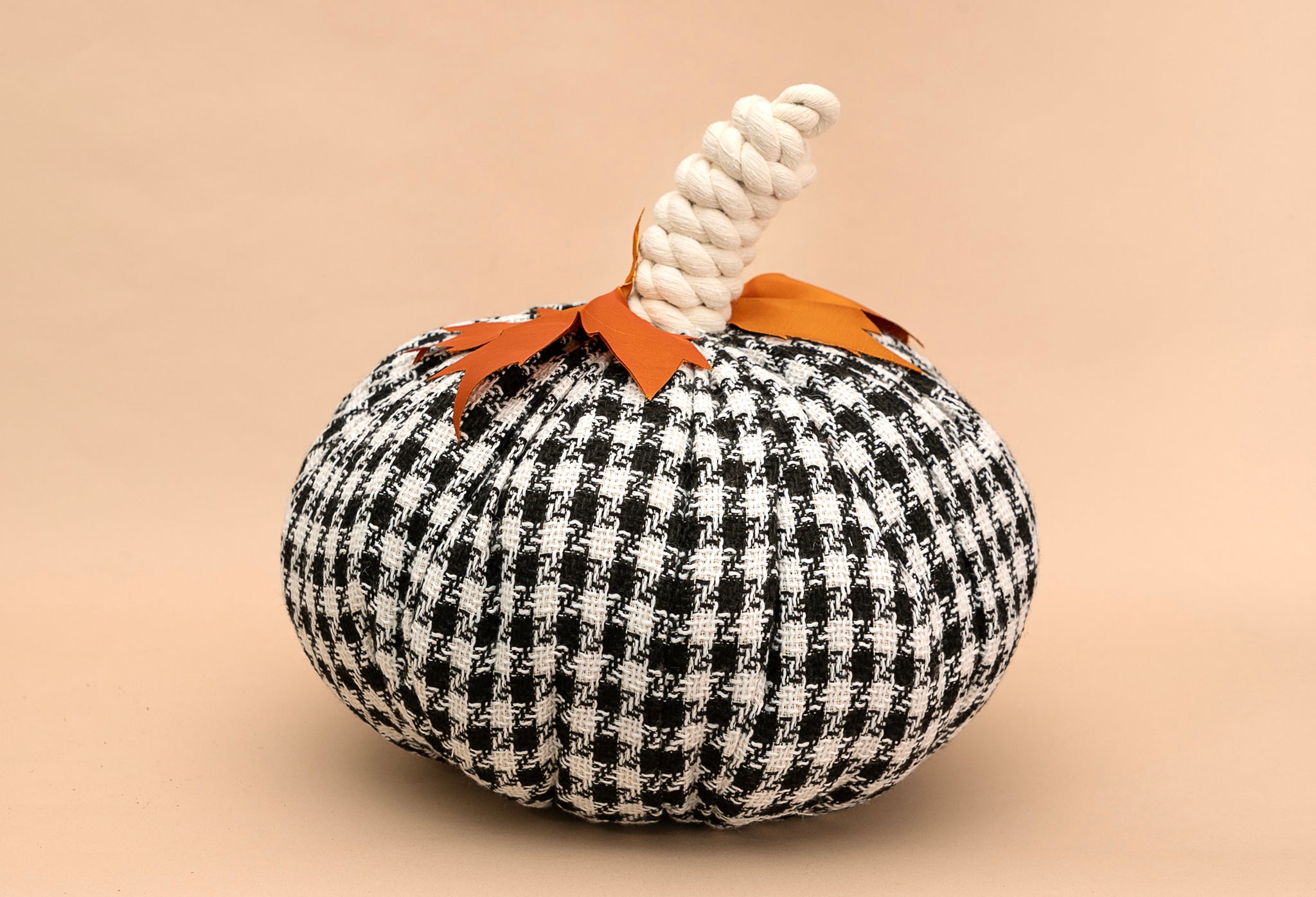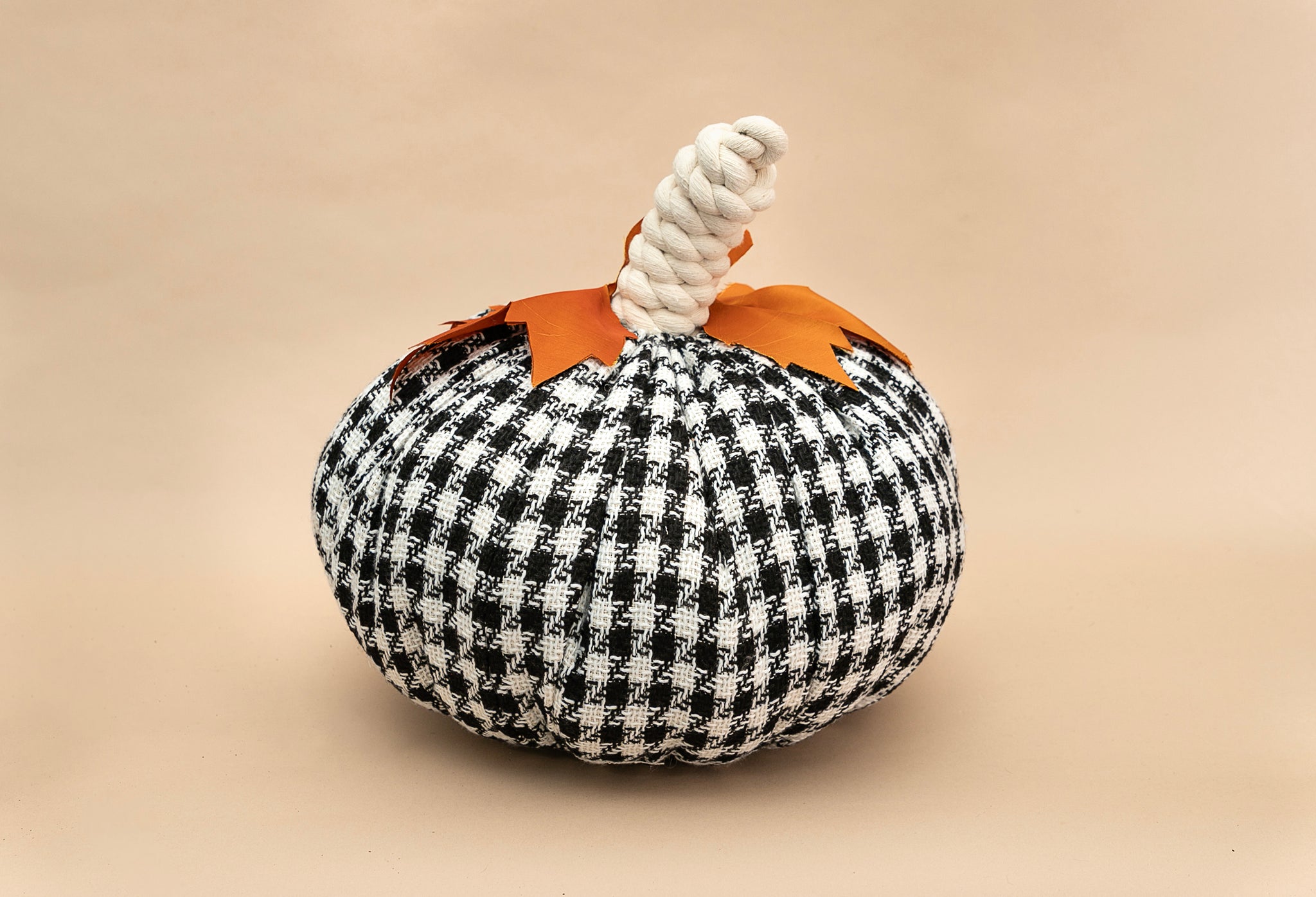Dale un estilo moderno y acogedor a tus espacios con nuestra calabaza de tela hecha a mano en diseño de cuadros blanco y negro. Su combinación neutra y elegante la convierte en una pieza versátil, ideal para decorar durante el otoño, Día de Muertos o Halloween, e incluso para ambientar rincones especiales de tu hogar en cualquier temporada.