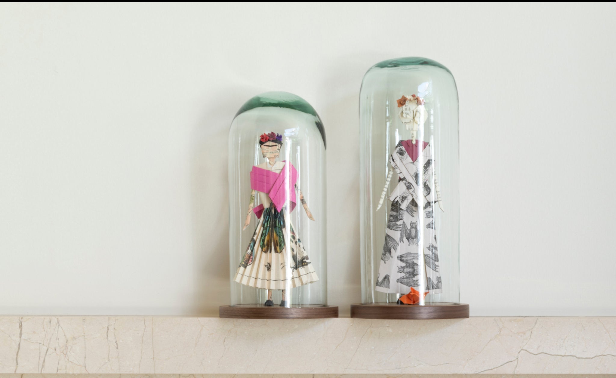 Cada figura está elaborada a mano con origami en papel artístico, cuidando cada pliegue y detalle para resaltar su personalidad. Vienen montadas en una base de madera con capelo de vidrio, que las protege y convierte en piezas de exhibición atemporales.