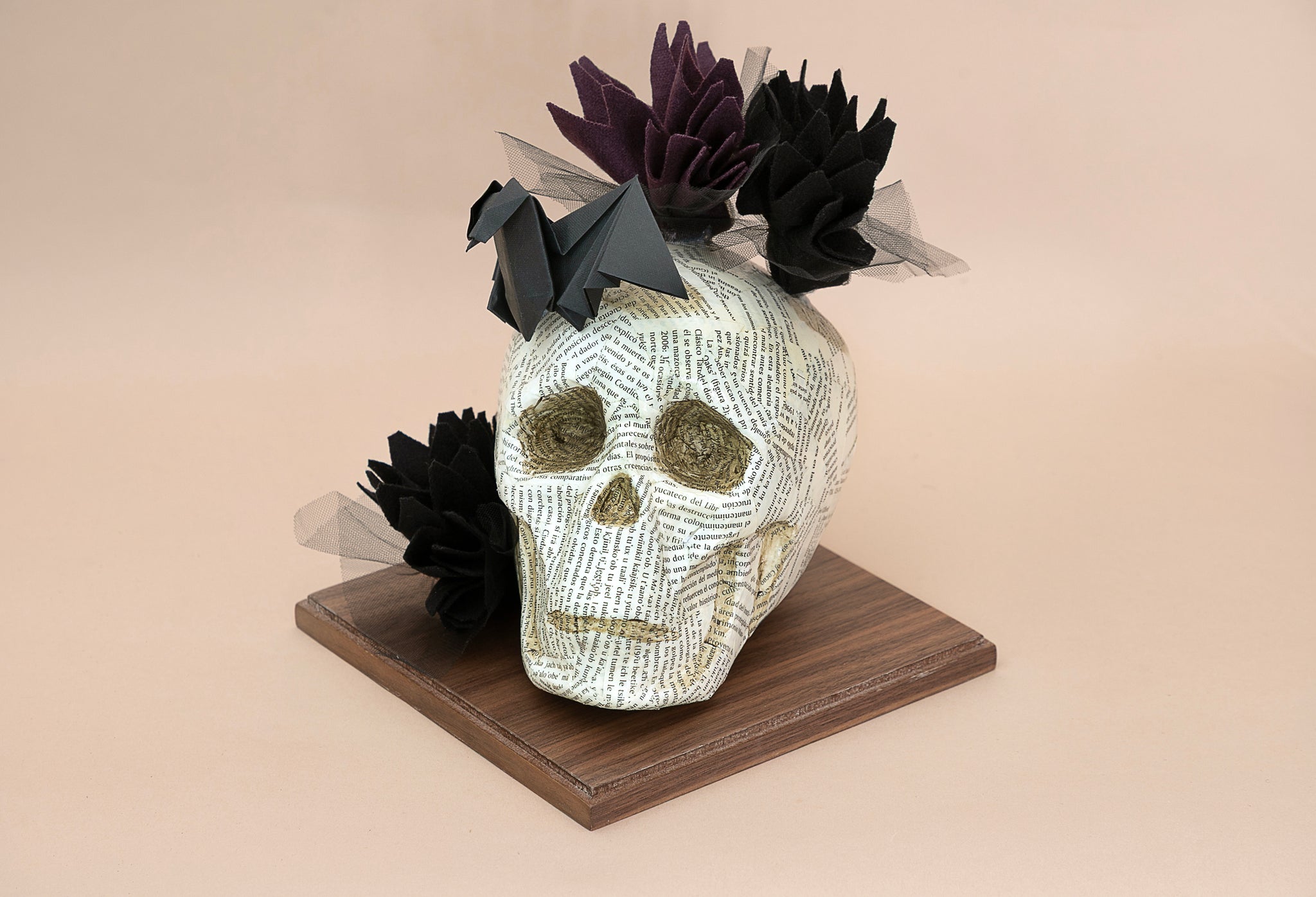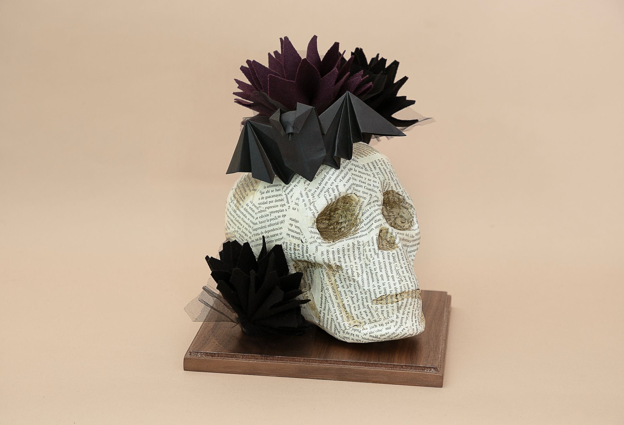 Esta pieza artesanal combina tradición y diseño contemporáneo: un cráneo de papel acompañado de flores de origami en tela y un delicado murciélago en papel especial, todo dentro de un capelo de acrílico con base de madera.