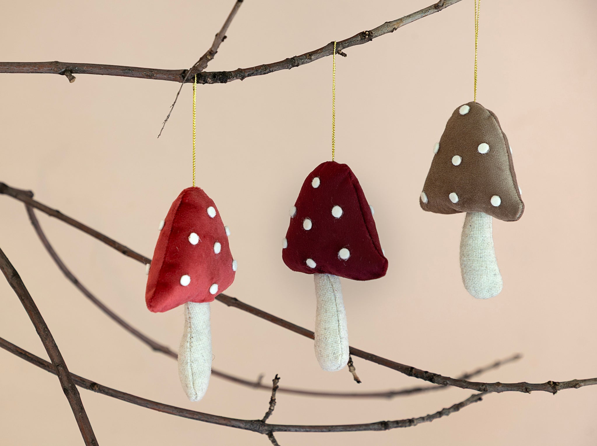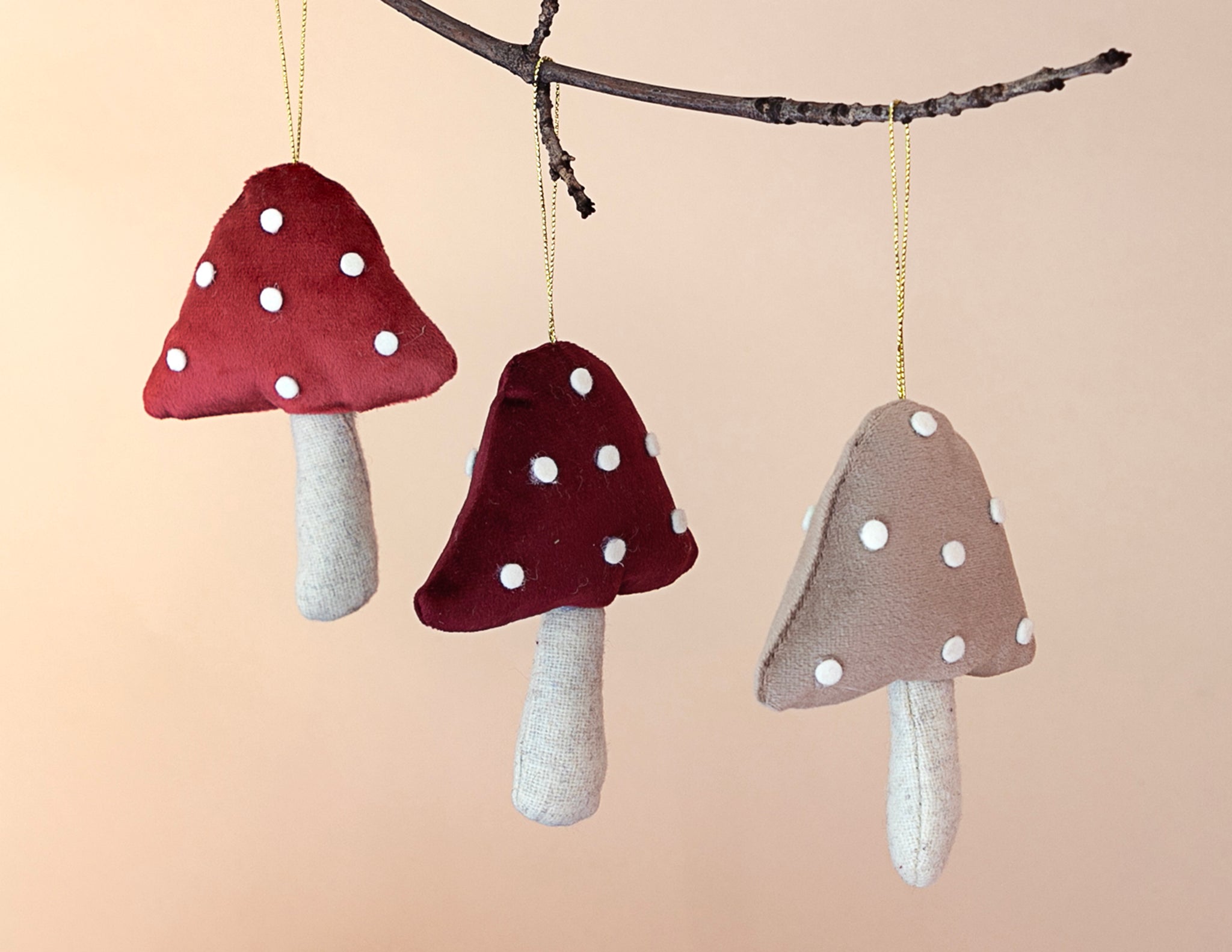 Inspiradas en los honguitos del bosque, nuestras esferas Mush están hechas a mano con terciopelo y tela tipo lino, decoradas con pequeñas manchitas de lana color hueso que les dan textura y un aire cálido y acogedor.