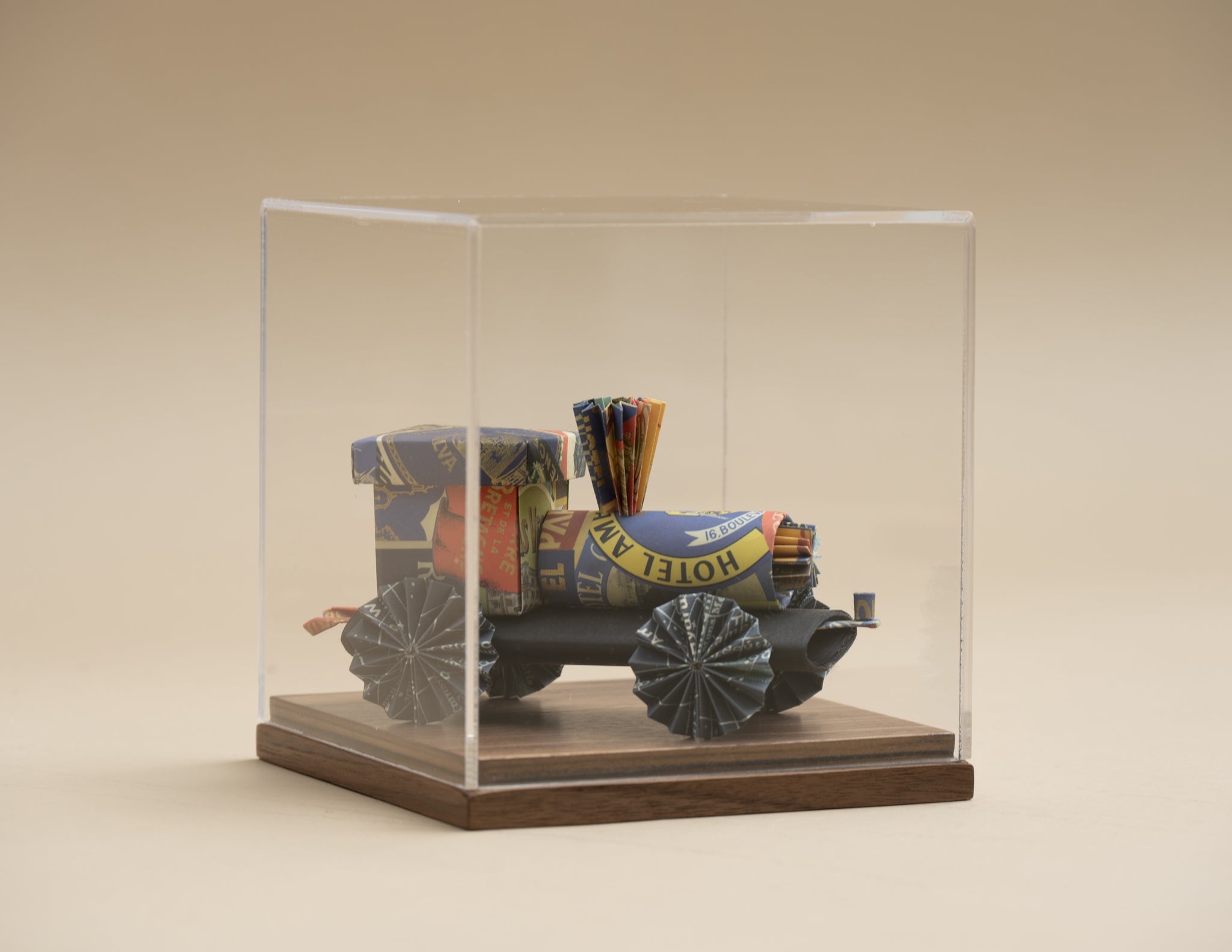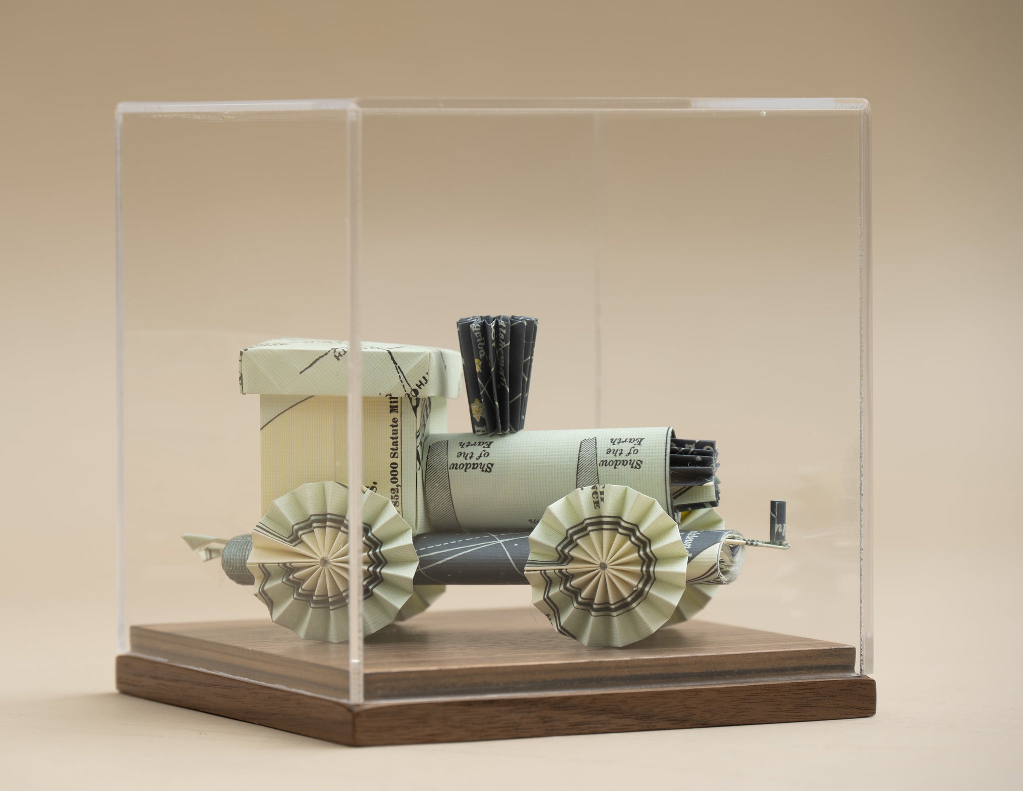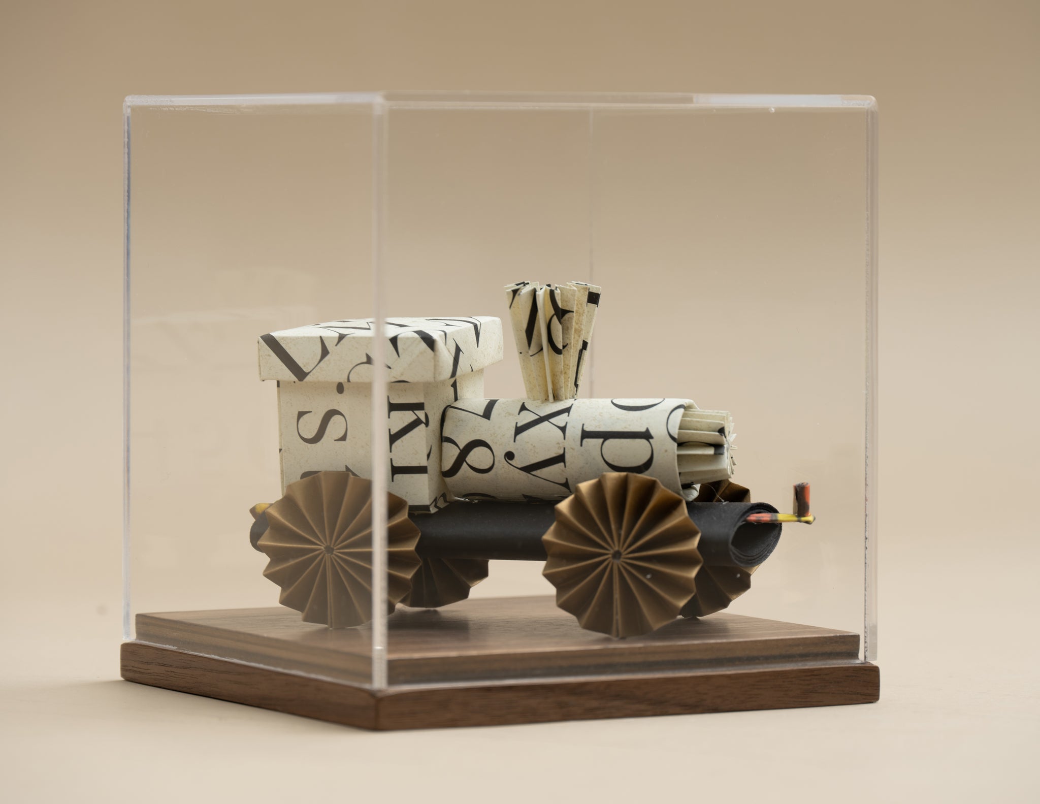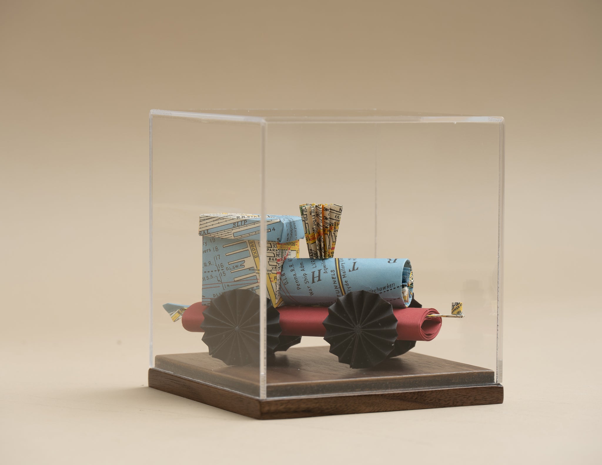 Tren de origami hecho a mano con papel especial, encapsulado en caja de acrílico.